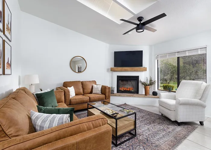 La Stylish Townhome On Golf Course Red Rock View se encuentra a 10 minutos en coche del Courthouse Vista e invita a los huéspedes a disfrutar de una terraza. Situada en el barrio Village of Oak Creek, esta villa cuenta con una piscina, además de un jacuzzi y una bañera de hidromasaje.